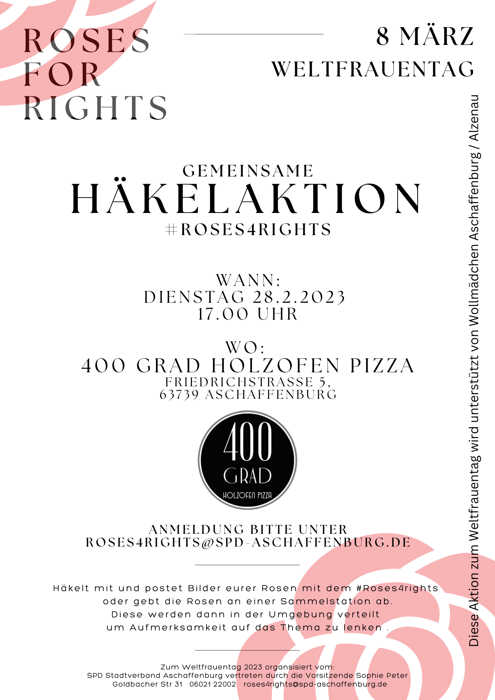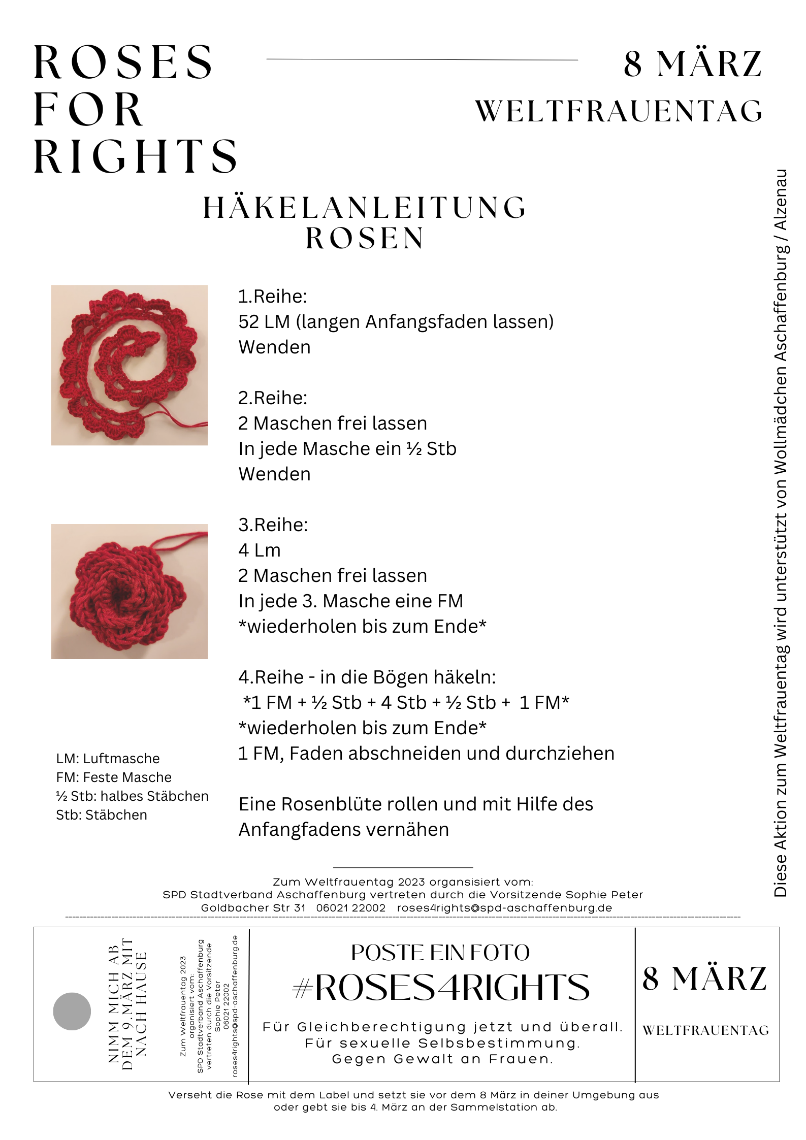 Häkelt mit uns Rosen! Denn für Frauen ist noch nicht alles rosig. Das ist das Motto der diesjährigen SPD Aschaffenburg Aktion zum Weltfrauentag am 8. März.