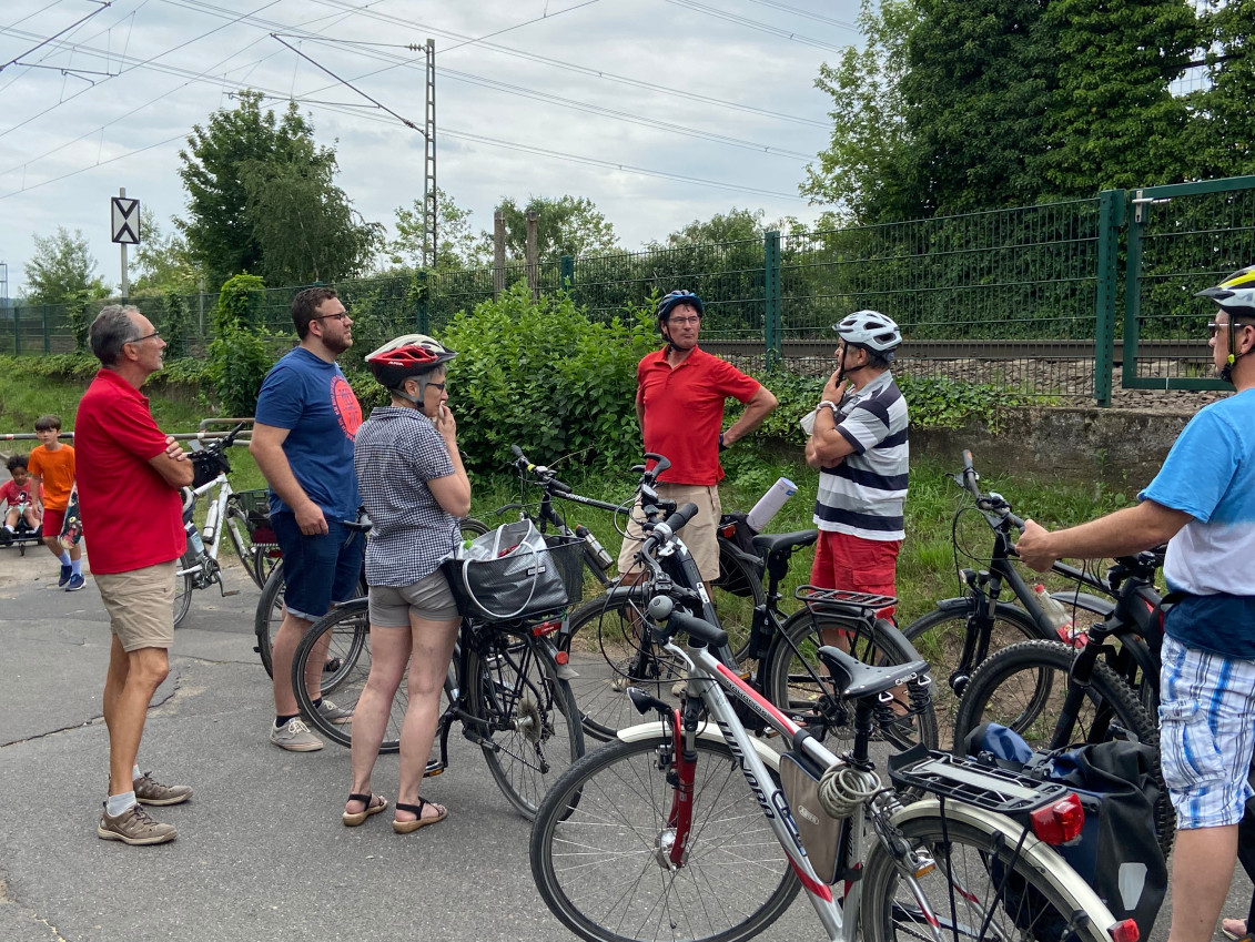Über den neuen Radweg am Sonneck ging es nach Stockstadt, wo der zweite Bürgermeister Dieter Trageser das Projekt Mainquerung erläuterte. Jahrelange Verhandlungen mit der Bundesbahn, der Eigentümerin der Bahnbrücke und des angehängten Radwegs, hätten das völlige Desinteresse der Bahn an einer barrierefreien Mainquerung für Fußgänger:innen und Radler:innen gezeigt. Nachdem mit der Bahn keine Lösung erreichbar sei, versuchen jetzt die Gemeinden Stockstadt, Mainaschaff und der Landkreis Aschaffenburg mit einer Machbarkeitsstudie eine Fahrradbrücke zu verwirklichen. „Radfahren ist gut für unsere Umwelt und Gesundheit. Aber man merkt auch bei uns, dass der Autoverkehr immer noch Vorrang im Alltag hat. Die Politik muss hier aktiv Angebote schaffen!“, so Tobias Wüst.