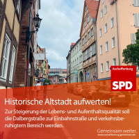 Zwischen den Fachwerkhäusern auf dem Dalberg, im historischen Kern Aschaffenburgs, spazieren gehen, Zeit verbringen und mit Freunden einen Kaffee trinken. So stellt sich die SPD Aschaffenburg die Zukunft auf dem Dalberg vor.