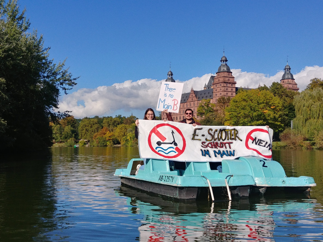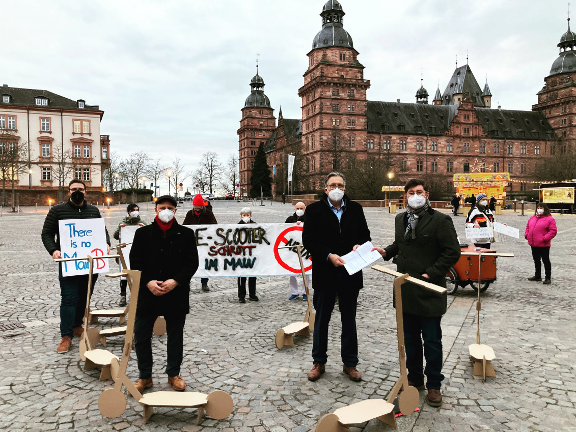 Zu Beginn der Sitzung des Planungs- und Verkehrssenats hatte die SPD vor der Stadthalle ein Banner gezeigt „E-Scooter Schrott im Main? Nein“ und zahlreiche Pappattrappen der E-Scooter auf dem Vorplatz verteilt. Außerdem hatte Oberbürgermeister Jürgen Herzing den Aufruf entgegengenommen, welcher von 524 Bürgerinnen und Bürgern unterzeichnet wurde. Die Aktion war beim Ordnungsamt angemeldet und Maskenpflicht und Abstandsgebote wurden eingehalten.