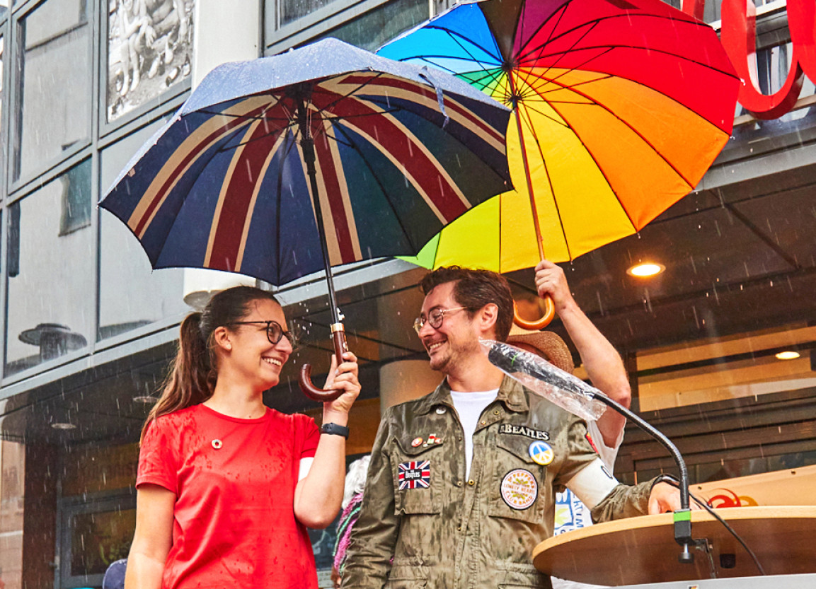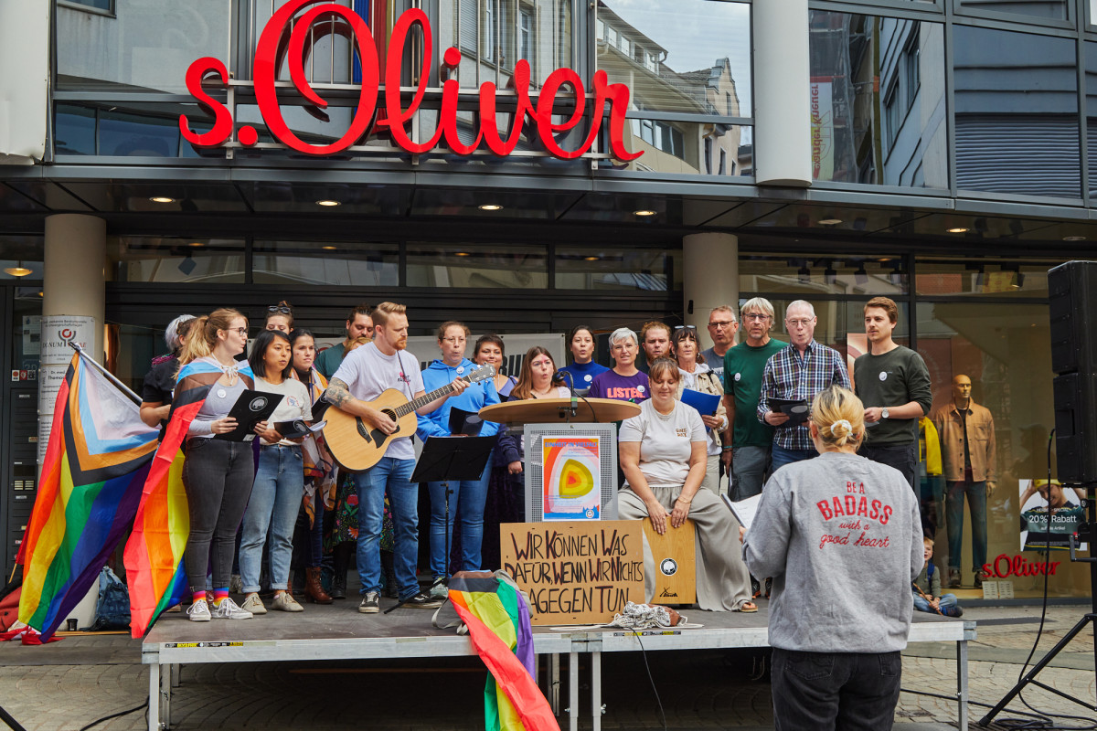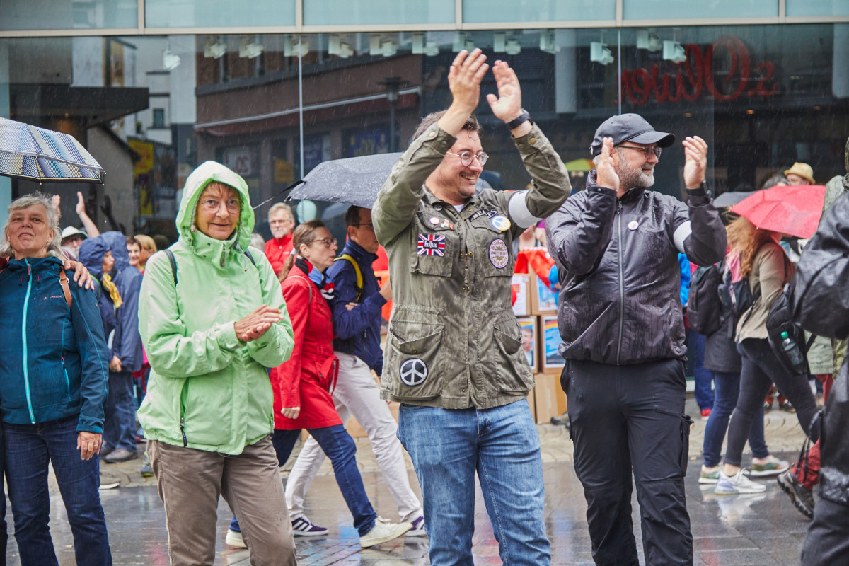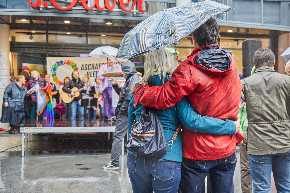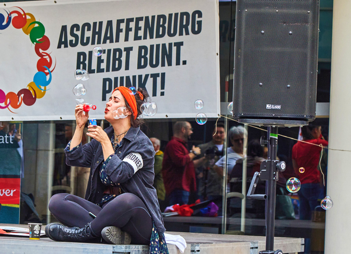 Die musikalischen Beiträge des Aschaffenburger Kneipenchors sorgten für eine positive Atmosphäre und bewegte die Menschen dazu, trotz des einsetzenden und zunehmenden Regens, mitsingend vor Ort zu bleiben. Obwohl die geplanten Redebeiträge des DGBs, Jugendparlamentes und der Jusos aufgrund des Wetters nicht stattfinden konnten, blieben die Menschen vor Ort und zeigten damit, dass weder Regen noch widrige Umstände sie von ihrem Engagement für eine demokratische und vielfältige Gesellschaft abhalten können.